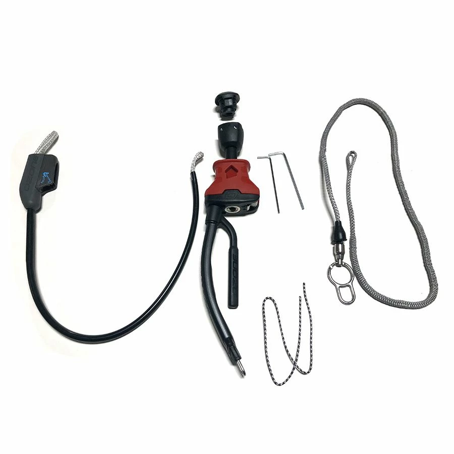 The Ozone V5 Click-In Loop Upgrade / retrofit kit includes the push-away release system, medium harness loop with lock tube, PU-covered Amsteel depower line, new cleat, cleat trim line, stainless steel swivel ring, and flag out bungee line. The chickenloop retrofit kit works as a replacement for Contact Water and Foil Freeride Megatron and V4 bars.